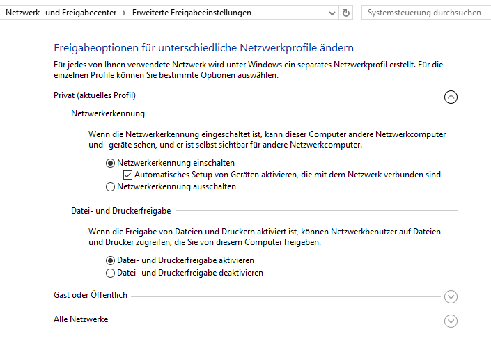 Hilfreich könnte es auch sein, auf Server und Client die Datei- und Druckerfreigabe für das private Netzwerk zu aktivieren.